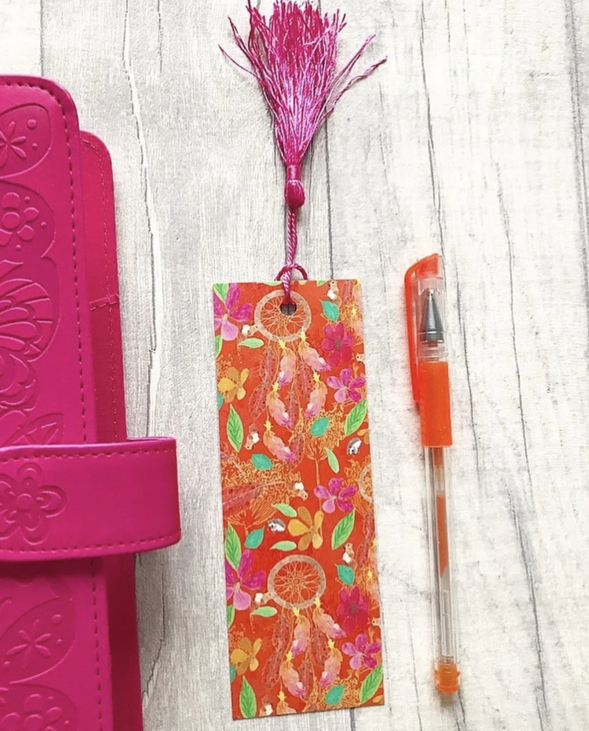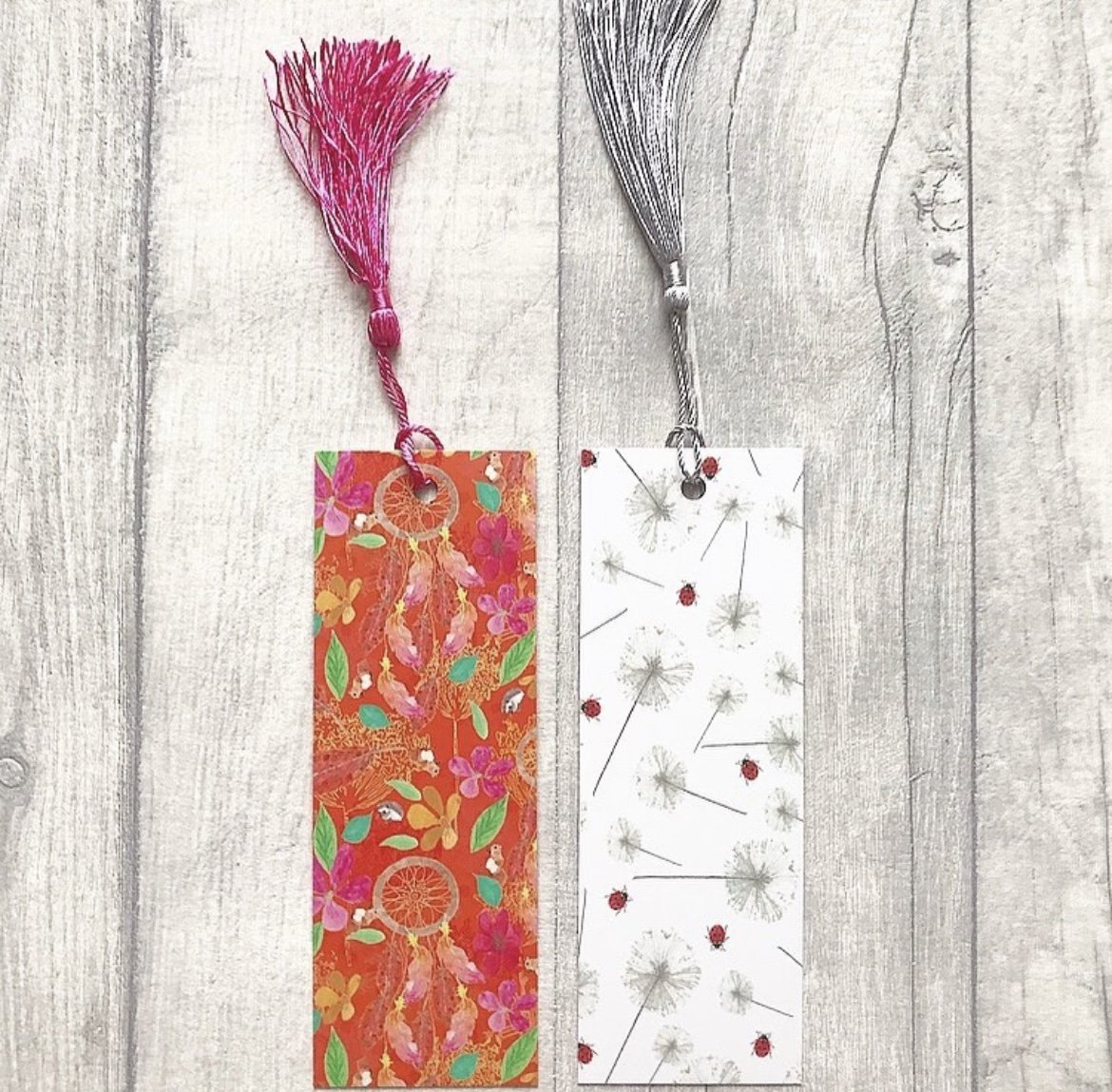 Each bookmark is made from 400gsm silk coated paper, which has a low surface sheen yet a luxurious feel; it is laminated on both sides. The size is 5.3cm x 14.8cm and each bookmark comes with a matching tassel to finish it off. The pattern is on both sides.